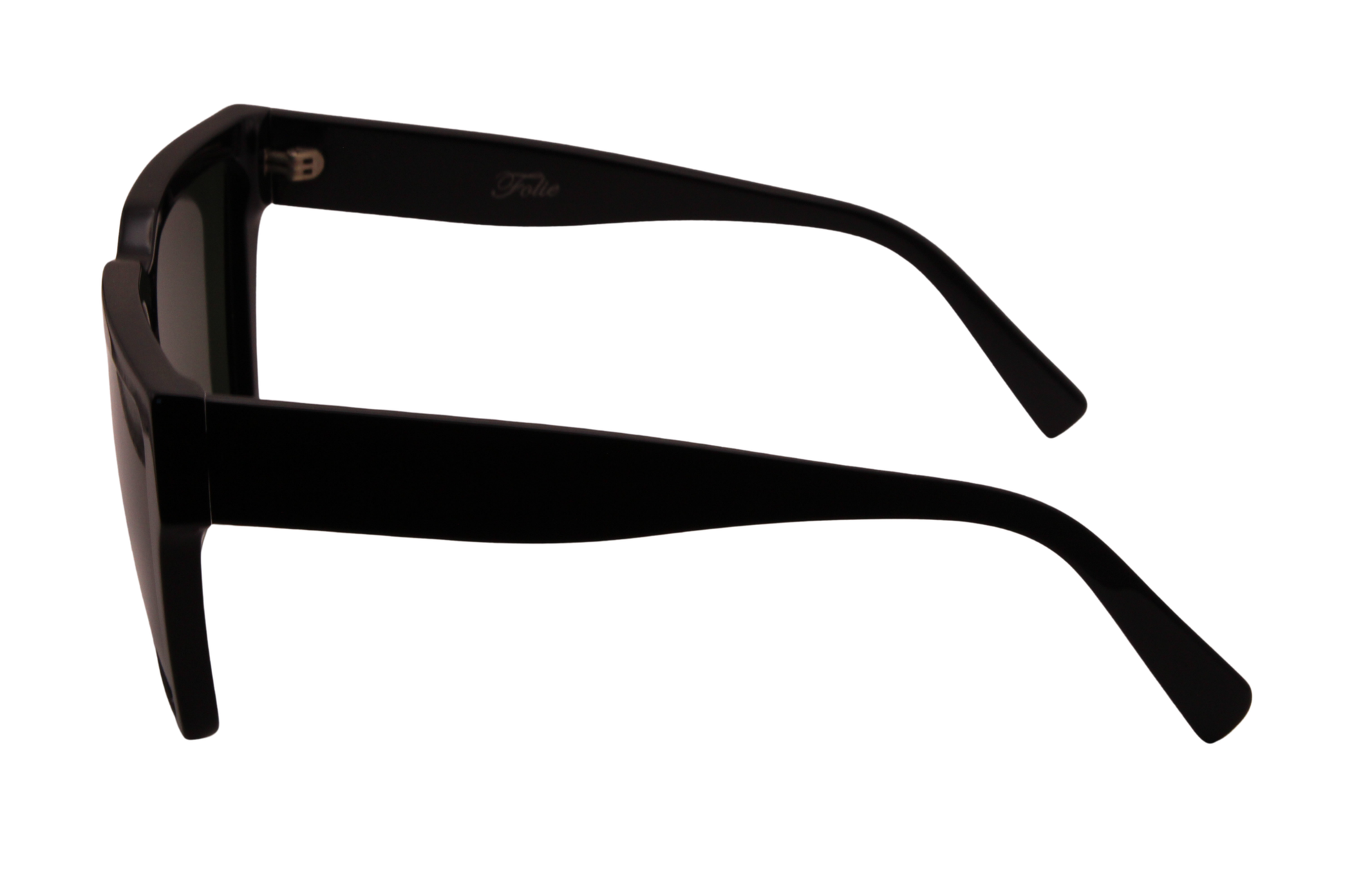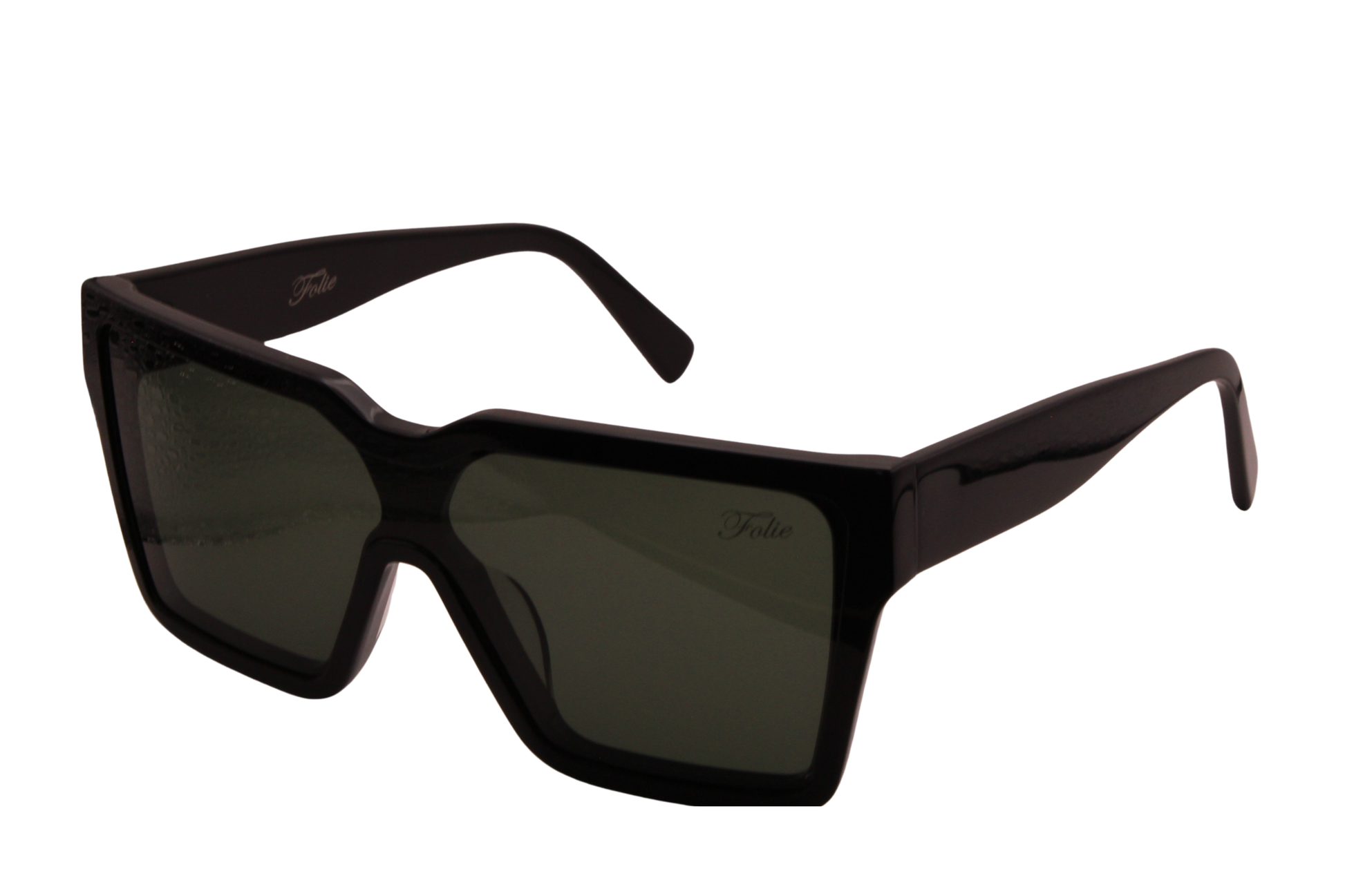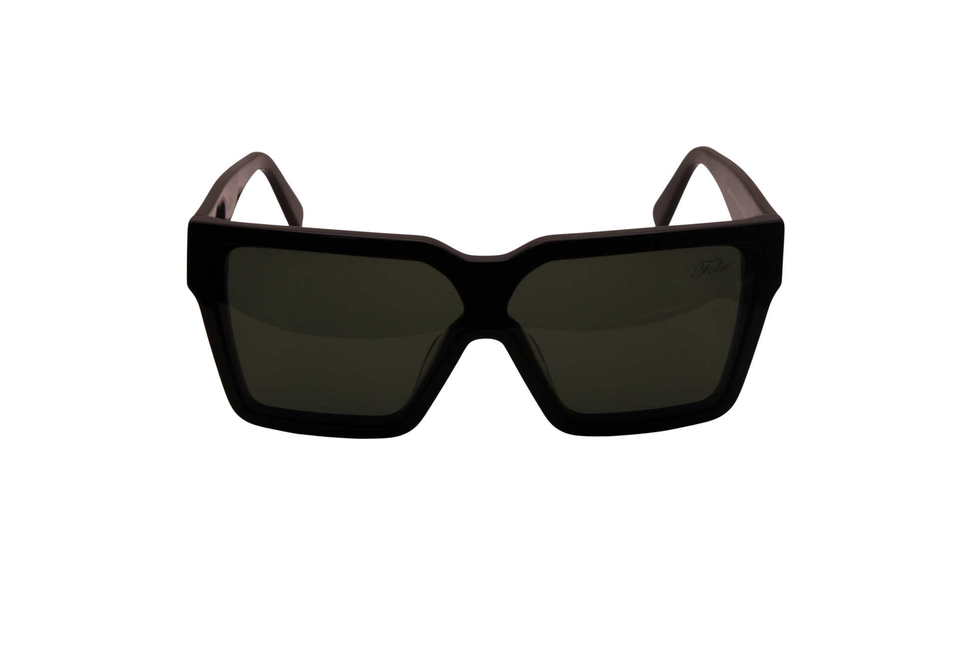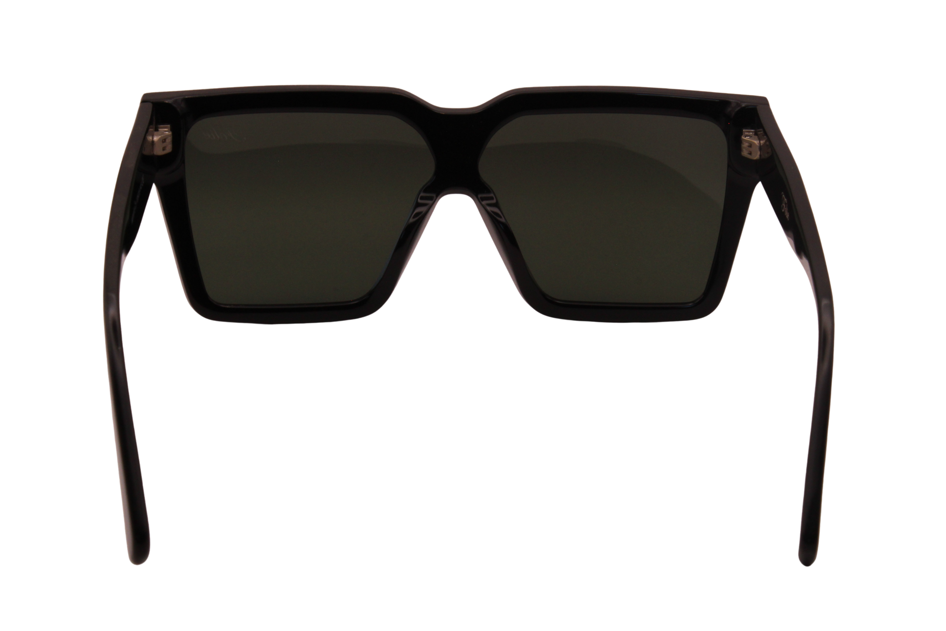 Edgy rectangular sunglasses with a thick black frame and sharp angles. The green lenses add a touch of mystery and modern confidence.
