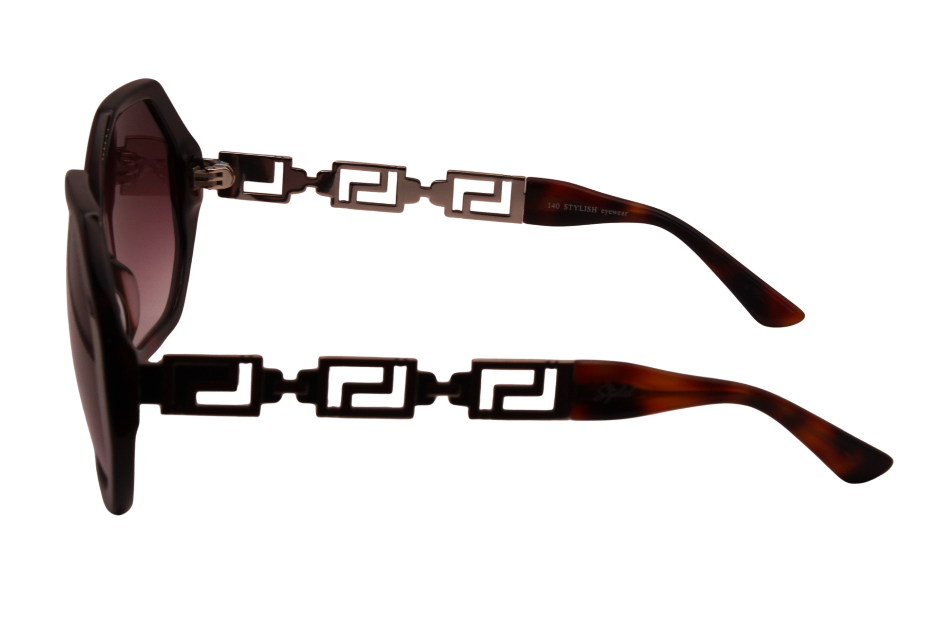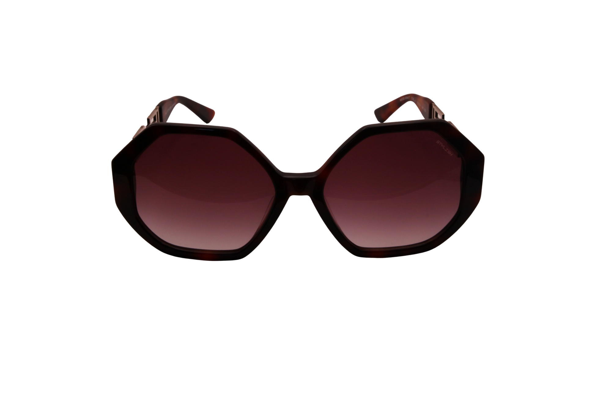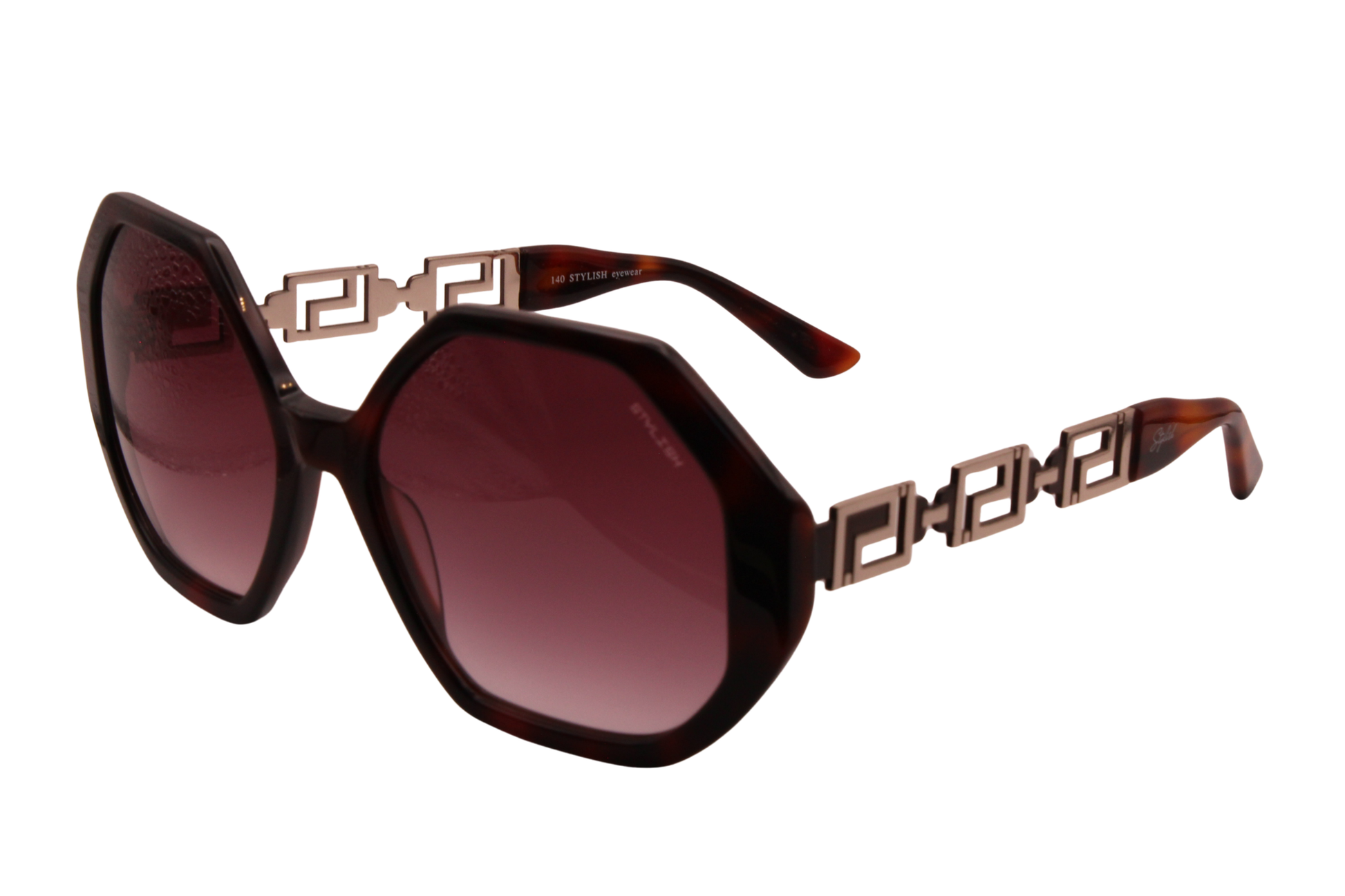 With a bold geometric hexagonal shape and gradient purple lenses, these sunglasses are a true fashion statement. The standout feature is the metal temple detailing that spells "STYLISH," adding a glamorous edge to this modern design. Perfect for turning heads.